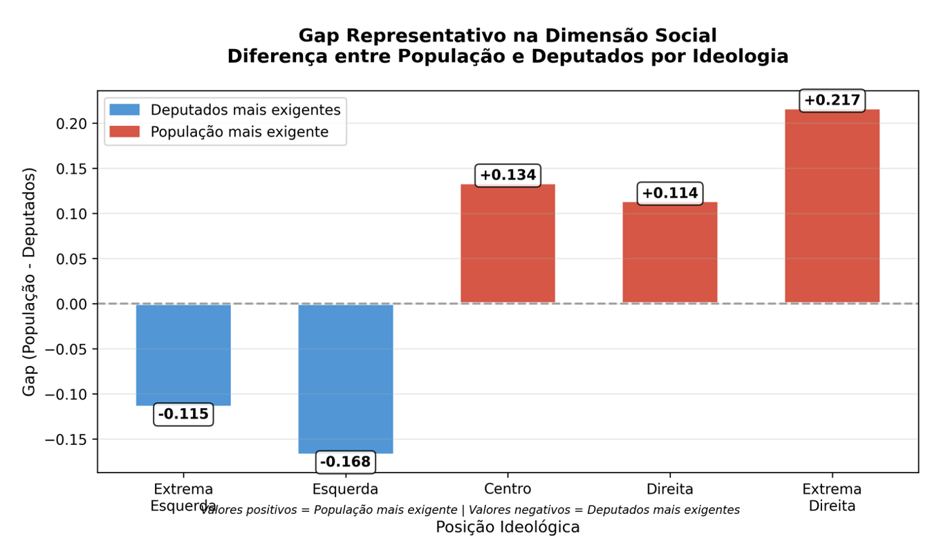 Na esquerda, observa-se o padrão inverso: deputados são mais exigentes que sua base na dimensão social (gaps negativos de -0,115 e -0,168), sugerindo alinhamento progressista entre representantes e representados.
