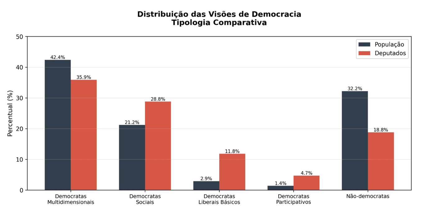 Entre deputados, chama atenção a maior concentração de liberais básicos (11,8% vs. 2,9% população) — perfil que valoriza apenas procedimentos, sem compromisso com dimensões redistributivas. Este perfil é quatro vezes mais comum no Congresso do que na sociedade.